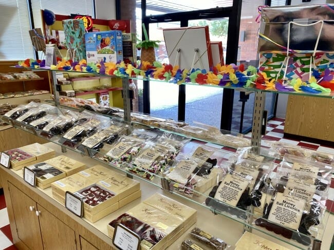 After enjoying the chocolate bark at the Fort Smith shop, I bought some more to take home, along with a box of assorted chocolates. Those, too, didn’t last long. According to Greer, other popular items include peanut brittle, Ozarkies (vanilla cream rolled in pecans and covered in chocolate), pecan treats (caramel and pecans covered in chocolate), and seasonal favorites like chocolate-covered strawberries and Karamel apples.