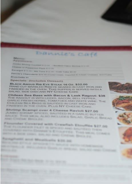 Dannie’s Cafe menu is unlike anything you’re likely to find on a patched-up county road in Arkansas. Items like full rack of New Zealand lamb marinated in a curry sauce, Chilean sea bass with bacon and leek ragout, and prime black-Angus ribeye steak.