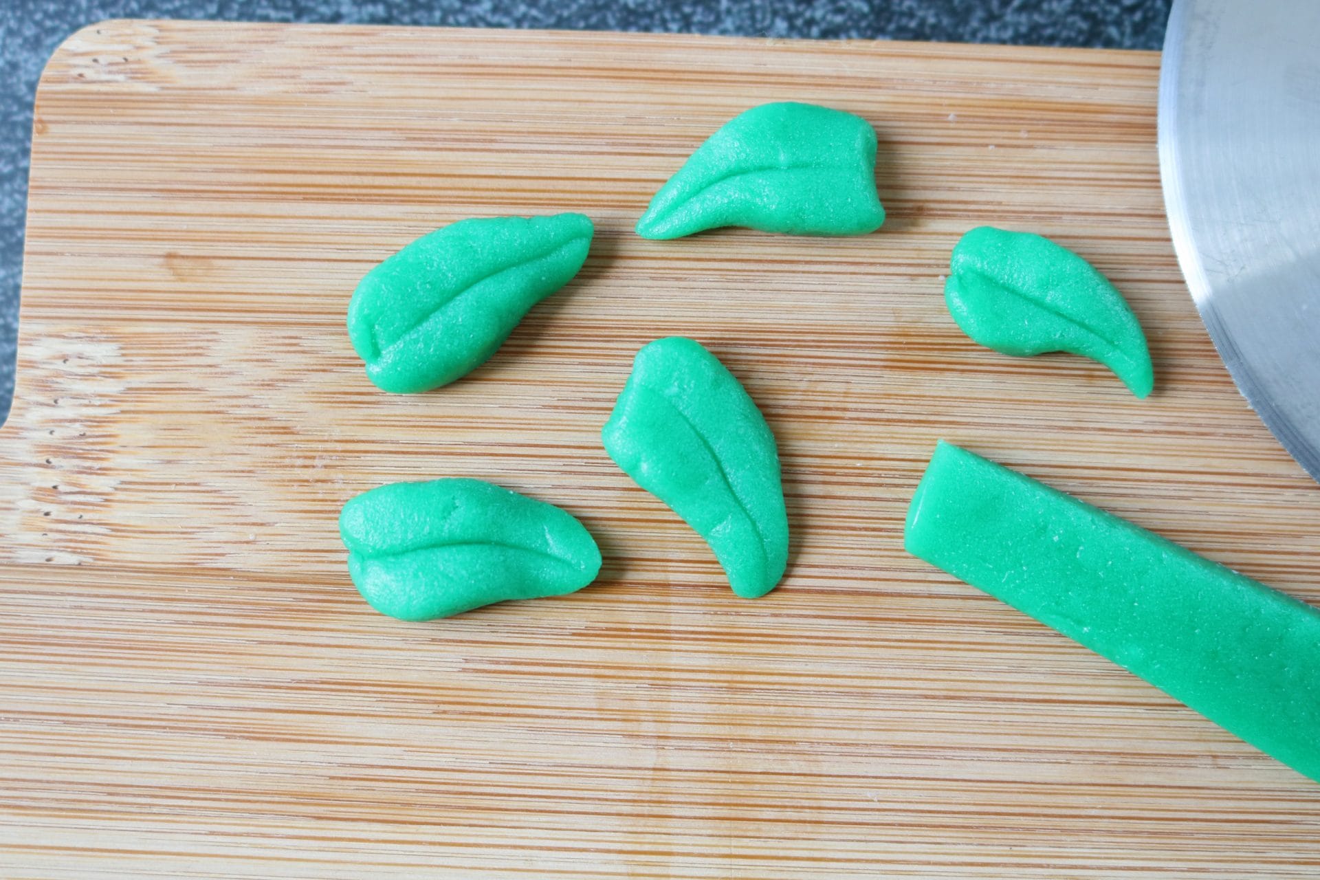 Using a pizza cutter, cut rectangle candy in half lengthwise. Cut each half into 5 triangles. Lightly roll pizza cutter across triangle to make leaf vein. Using your fingers, gently mold candy triangles into leaf shapes. (See pictures for visual steps.)
