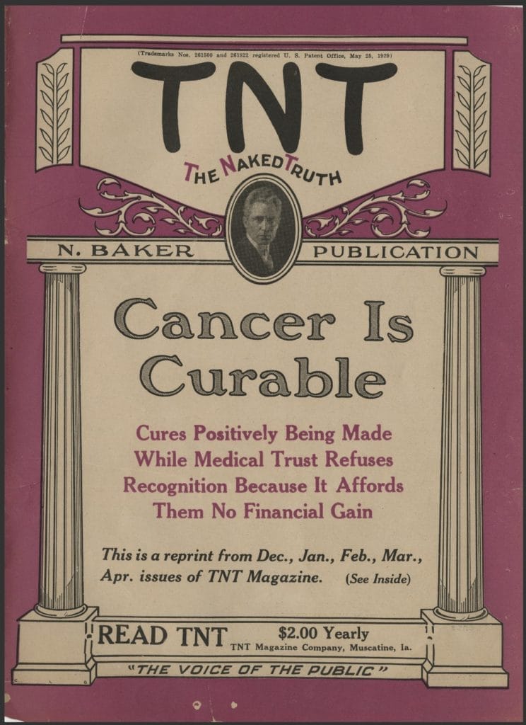 Born and raised in Iowa, Norman Baker spent nearly ten years as a performer in his own traveling vaudeville-inspired troupe before he began a radio show in 1925. KTNT (Know The Naked Truth) was heard nationwide and provided Baker with a platform to discuss rural and small-town issues, including denouncing the American Medical Association. He used his platform to promote Herbert Hoover’s presidential campaign, which paid off when the newly elected president helped launch his newspaper, the Midwest Free Press and a tabloid magazine called TNT.