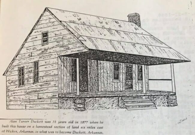 “First off, it will show up as Duckett Ford on maps, if it shows up at all,” Childs tells me. “And if you find maps with Duckett Ford, you’ll see other fords along the Cossatot. It’s my impression that the Cossatot River was never particularly navigable, which goes to explain why that area was so late to settle. Water was the way to get anywhere until the trains came.” Childs’ great aunt Sarah “Sallie” Duckett filed for a homestead on the Cossatot River a few weeks before she married Allen Turner Duckett, so the ferry became known as Duckett Ferry.