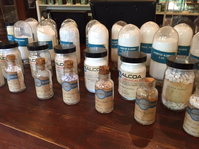 The Aluminum Company of America, better known as ALCOA, built an ore-drying plant in Bauxite in 1903. Until December 1, 1968, the company was the driving force of Bauxite, building a community center, which still stands and serves as the museum, hospital, school, employee housing, a theater and a company store. A stroll through the museum reveals pay envelopes from the 1930s stipulating $18 per pay period with deductions itemized, including a cash advance, rent, hospital, coal, insurance and the Bauxite Merchandise Co., among others.