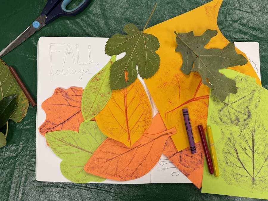 As an art teacher, I have always loved exploring textures. My students, especially the younger ones, love creating texture rubbings. It’s simple to do–just place your paper over a textured item like a leaf or a bit of bark, grab a “naked” crayon, and rub it over the paper. Use brown, red and purple crayons over warm colors (I also used green), then cut out the shapes and glue them down for a stunning page in your nature journal. For bonus points––label each leaf with the name of the tree it came from!