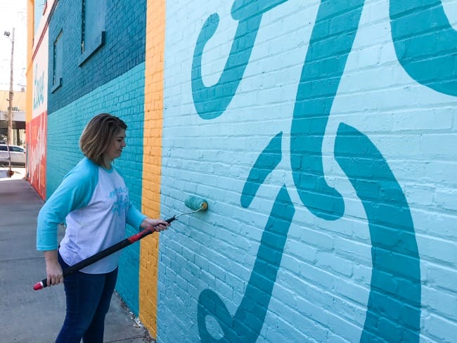 Peacock has never created a large scale mural but submitted a design anyway because she is the type of person who will “jump in with both feet and figure it out.” Jason White, a local professional muralist, worked closely with Tara to work out the logistics of creating a mural that went from a small design on a computer screen to a 100′ wide by 40′ tall painting on a building.