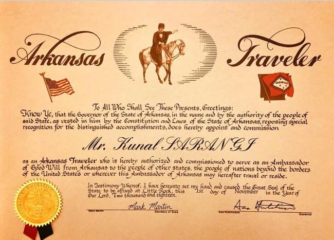 In 1941, the Arkansas General Assembly created the Arkansas Traveler Certificate to give to visitors to the state, especially to honor visitors like President Franklin D. Roosevelt, who received the first Arkansas Traveler certificate on his visit to Arkansas that year. The honorary title of Arkansas Traveler has also been given to Roy Rogers, Maya Angelou, Bob Hope and many other visitors, who each received the title and promised to be goodwill ambassadors to the state.