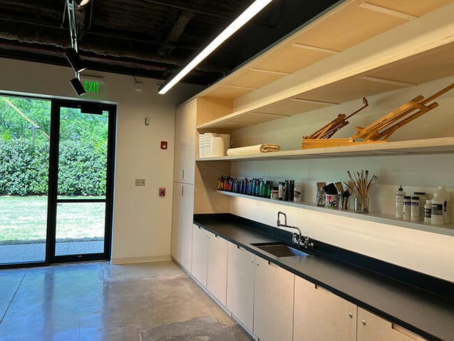 The school itself isn’t new; it was established in 1963. But the new facility offers 11,000 square feet of fully equipped studio space for instruction in drawing, painting, printmaking, ceramics, glass, wood and metalsmithing classes for children and adults, along with a gallery space for displaying student work. Additional features school include the Robyn and John Horn Gallery, dedicated studios for artists-in-residence, and the newly incorporated art lawn for outdoor classes and activities.
