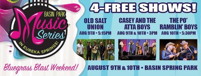 Head to Eureka Springs this weekend for some fun for the whole family with lots of FREE Live Bluegrass in the Basin Spring Park bandshell. Casey & The Attaboys and Old Salt Union will be performing.