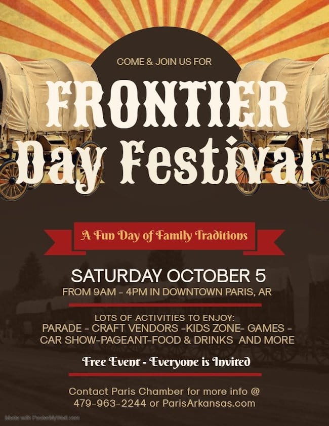 Frontier Day Festival is this weekend and will be held on the downtown square in beautiful Paris, Arkansas, this year! The best car show in the region and the longest-running festival in the region are joining together in one location this weekend. The day will kick off with a parade at 9 a.m. then head to the pancake breakfast hosted by the PHS Bank and then the opening ceremonies at 10 a.m. at the Eiffel Tower stage with special surprises. Plan to enjoy re-enactments from the Lawbreakers and Peacemakers with an Old West town set up on the south side of the square, Dutch oven cooking demos, and grab a free pumpkin sponsored by CASA all while shopping the downtown merchants and vendors. There will be fun live entertainment, and many food selections available. Kids will be able to play in the kid zone until their hearts are content. Also available this year are camel rides, petting zoo, bounce houses, pony rides and free pinewood derby races.Ā Also, after the festival, the Paris Riding Club is hosting a Junior rodeo starting at 7 p.m. It will be a full day of fun in Paris!