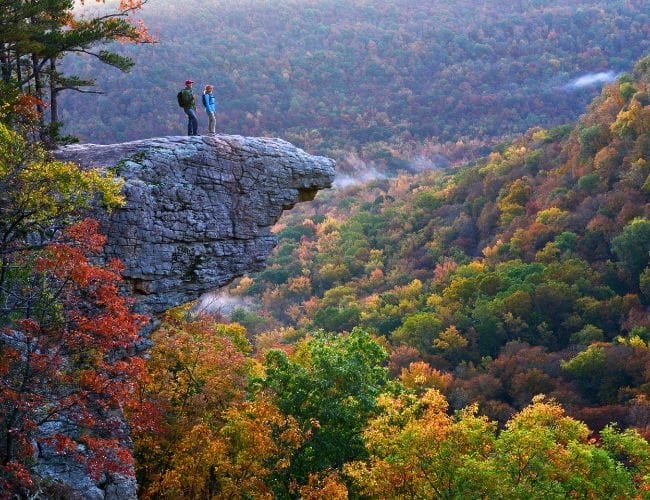1. Hawksbill Crag | Kingston: Nestled amid the picturesque Ozark Mountains, Hawksbill Crag, sometimes called Whitaker Point, is a testament to the sculpting power of time and nature. This sandstone bluff, reaching over 2,000 feet above sea level, offers breathtaking panoramic views of the surrounding countryside. Its rugged cliffs and intricate rock formations provide a playground for hikers and climbers seeking adventure. It is a dream destination in the fall months and a trip full of much trepidation on icy winter days.