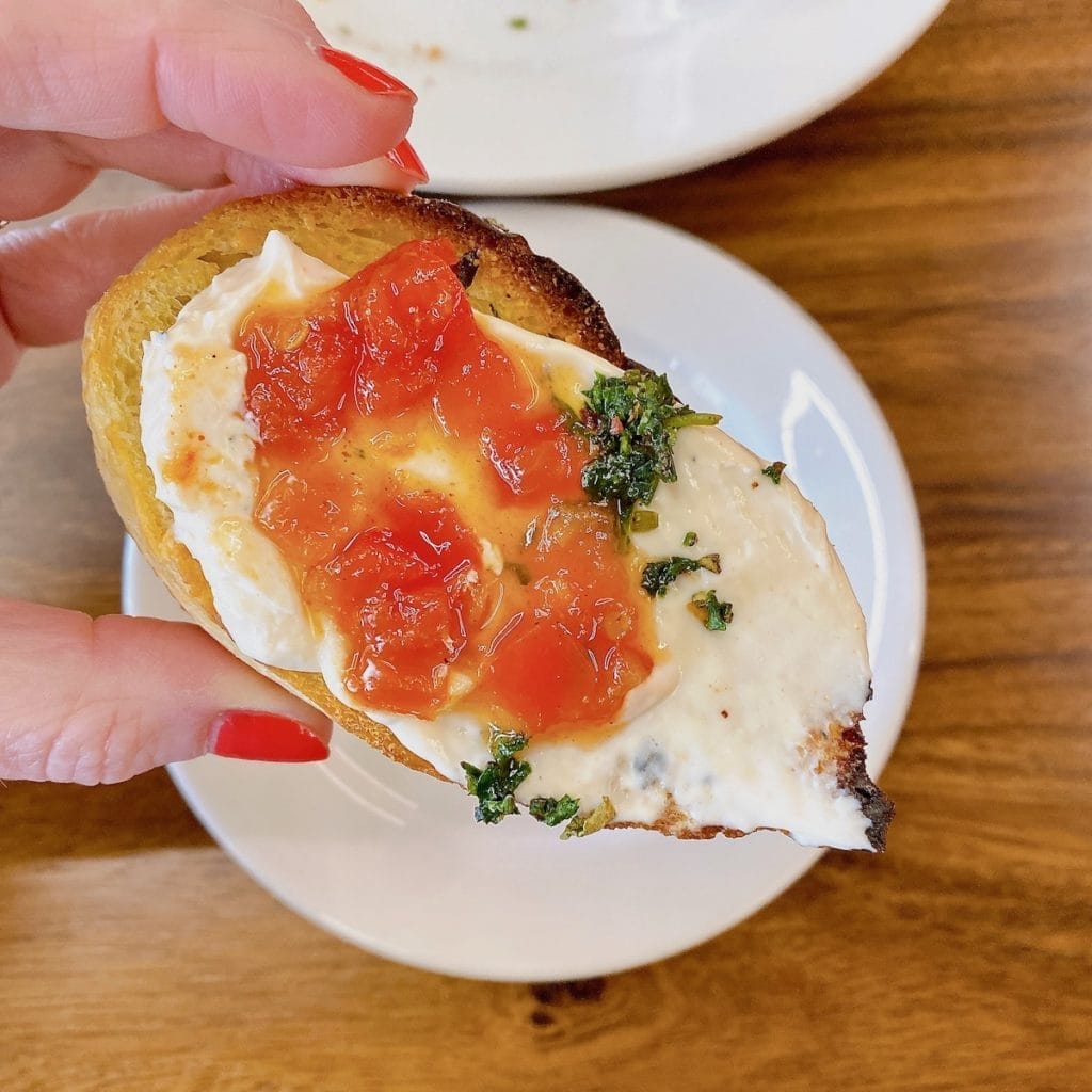 I recommend starting with the Garlic and Goat Cheese appetizer. It consists of roasted garlic and whipped herbed goat spread on crostinis with a side of tomato jam. Since I live just three minutes from the restaurant, I have stopped myself from running over every afternoon just for this alone!