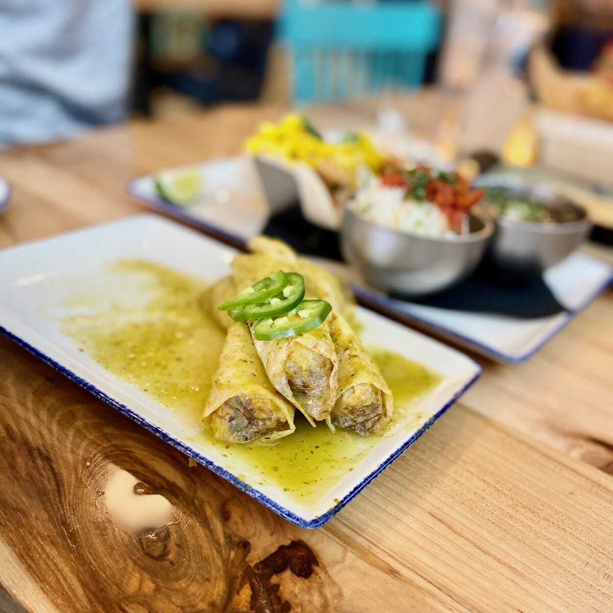 Their biggest taco seller is the Pickled-Fried Chicken Tacos, one of the “most beloved” items on the menu. Marinated overnight in pickle brine, this taco is fried in buttermilk and topped with red pepper chow-chow, pico de gallo, cilantro and Habanero Ranch.