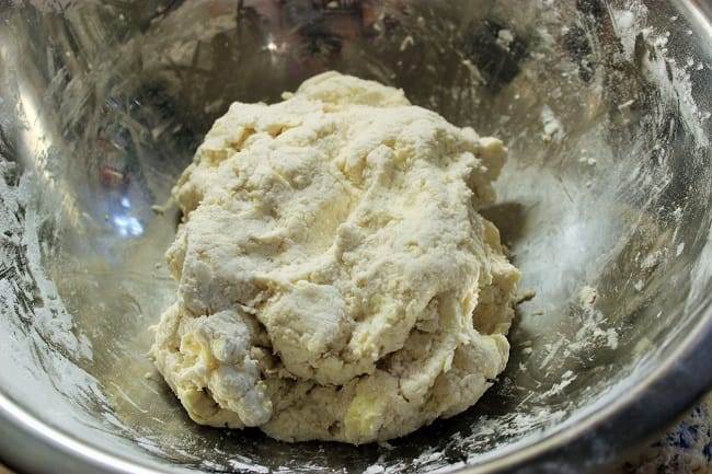 2. In a large bowl, mix flour, salt, and sugar with the butter. Make sure to not over mix the butter, as the clumps, when they release steam, give the biscuits a nice flakiness.