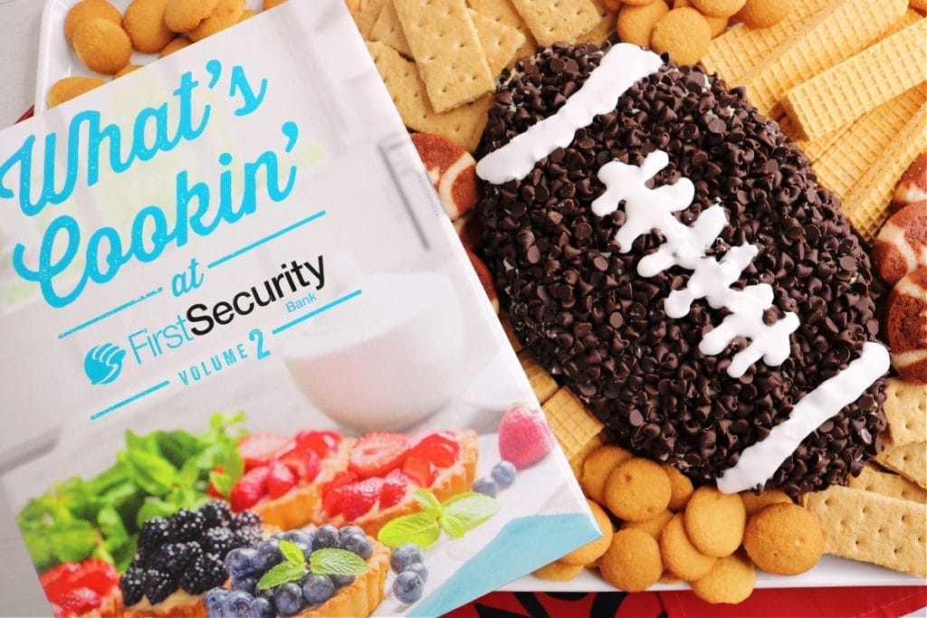 Thank you to Karen Derrick for this amazingly easy Chocolate Chip Cheese Football Recipe. There are over 800 recipes in the “What’s Cookin’ at First Security Vol. 2,” all submitted by employees and customers. Proceeds from the sales go to the Arkansas Hunger Relief Alliance to help feed people across the state. You can purchase the cookbooks for $20 at any First Security Bank location.
