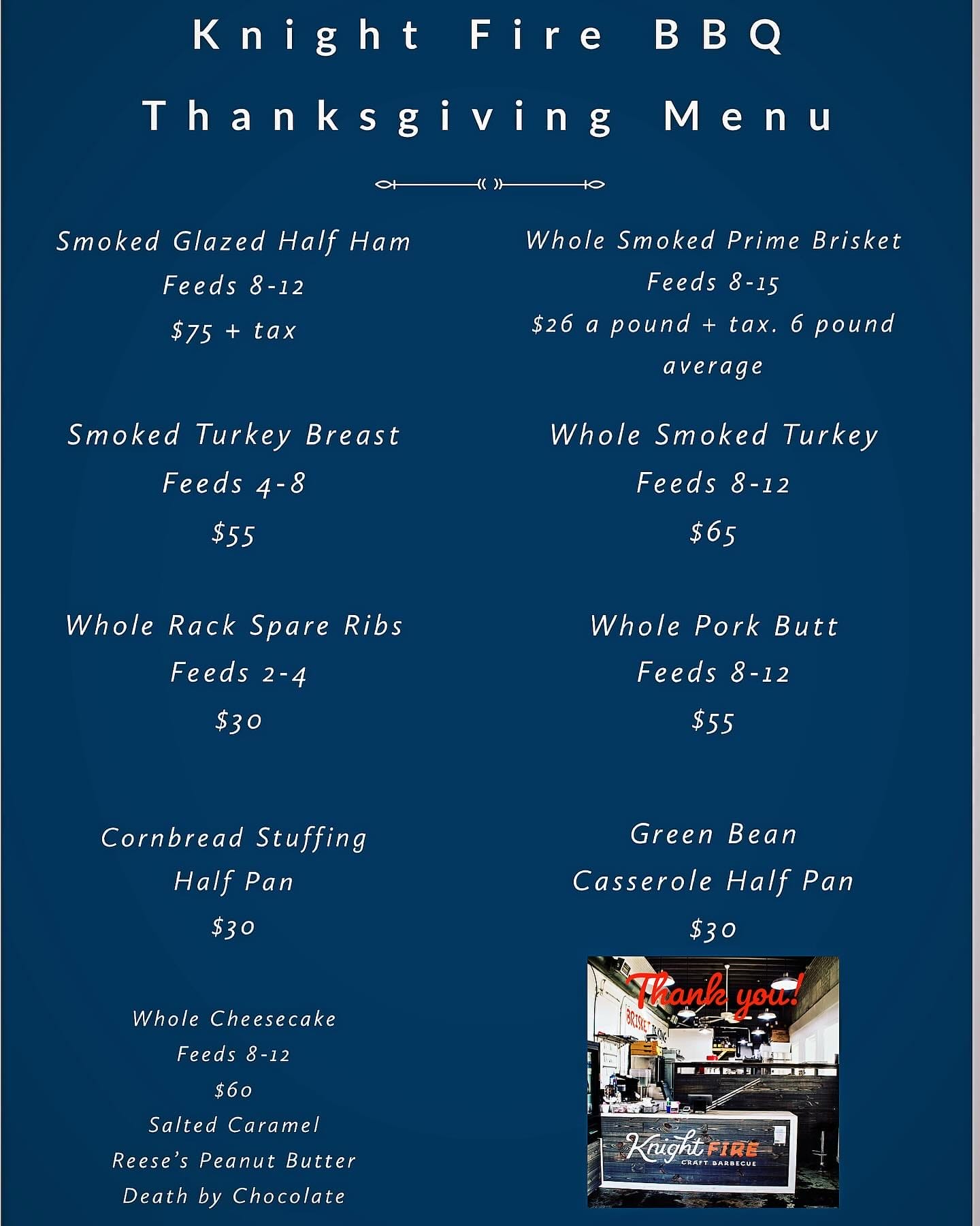 KnightFire BBQ in Searcy also does a Thanksgiving menu. This year, it includes smoked glazed half ham, whole smoked prime brisket, smoked turkey breast, whole smoked turkey, whole rack spareribs, whole pork butt, cornbread stuffing, green bean casserole, and whole cheesecake. We’re expecting guests this year, so we’ll be adding a smoked turkey breast and green bean casserole to go along with our Boulevard Bread order.
