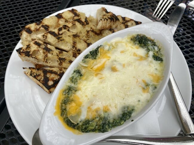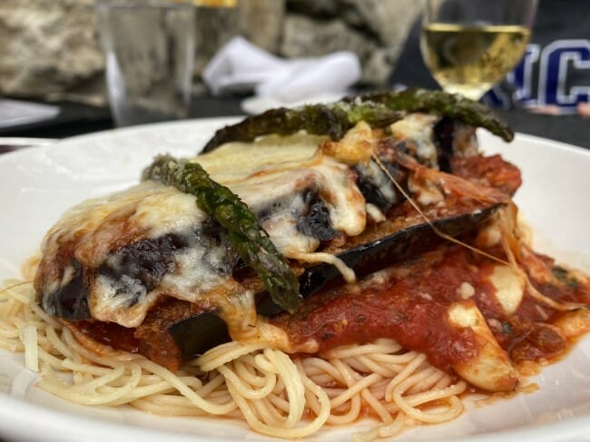 While my wife and kids focused on the pasta portion of the menu with orders of Eggplant Parmesan and Meatballs with Pomodoro, I couldn’t resist trying out the Sweet and Spicy Grilled Shrimp. Before those dishes hit the table, we split the Spinach Artichoke Dip appetizer, which was highlighted by the accompanying grill-marked toast and a dip with a nice balance of gooey cheese chopped spinach/artichoke.