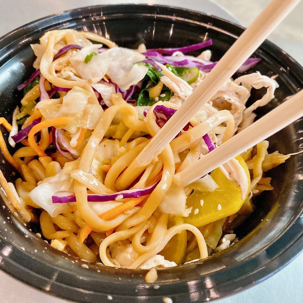 Dan Dan Noodles are another favorite which are flat wheat noodles covered in a homemade tahini sesame sauce topped with shredded chicken, pickled radish and pickled cabbage. Vegetarian switch-out with shiitake mushrooms and spinach instead of chicken is another great option.