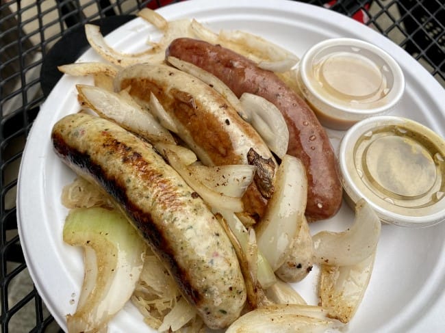 For our “3 Sausage Plate Without Bun,” we went with the beer brat, all-beef frank, and the chicken jalapeno sausage. All were delightful, especially the chicken with its variety of spices and subtle heat. Each sausage paired well with the accompanying thick-cut grilled onions and tart sauerkraut, along with the mustard condiments which proved to be a variation of spicy brown and honey mustard.
