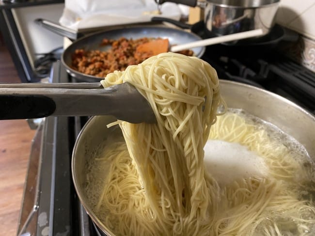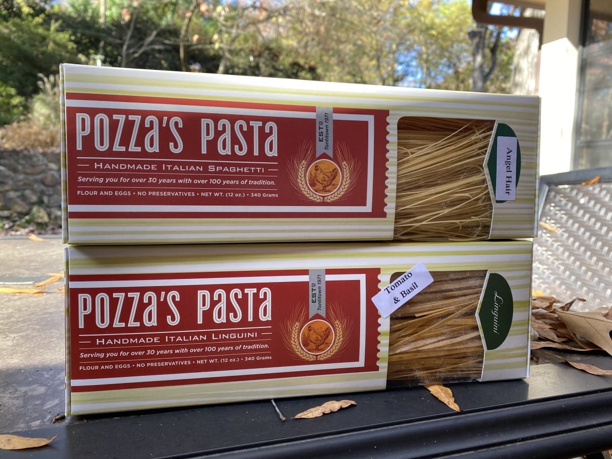 Pozza’s Pasta offers various flavors and pasta varieties, including spinach spaghetti, garlic and parsley linguini, whole wheat spaghetti, tomato and basil linguini and traditional angel hair, spaghetti and linguini. Through the years, I have tried them all and have yet to be disappointed in any of them. For first-timers, I recommend the traditional spaghetti. You will find this pasta to have a tad flatter shape and a bit softer texture than grocery store brands.