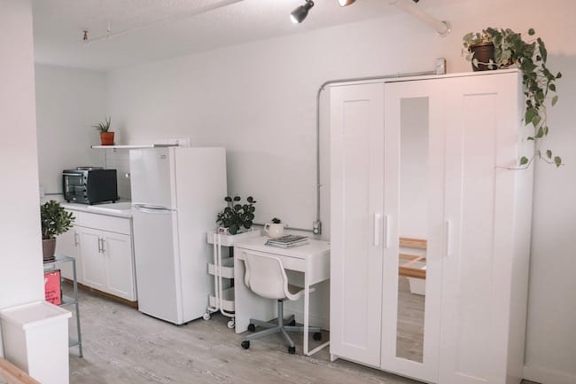 Bertel and his five-person crew turned the eyesore into a livable and lovable building, updating to a minimalistic design style that Bertel describes as European modern. The exteriors of the brick and cinderblock buildings are painted white, with neutral and black accents and cable railing across the second floor, giving it an open look. An outdoor dining area ringed by walls with murals has four picnic tables. It leads into a courtyard with a pool—not yet cleaned and open, in part because of social distancing policies—and a community garden. Tomatoes, squash, and strawberries grow in the garden, which were started from seed by one of the tenants. Plans for the courtyard include finishing an outdoor kitchen area and adding more murals. Ultimately, Bertel hopes that the comfortable courtyard can be a venue for live concerts and community events.