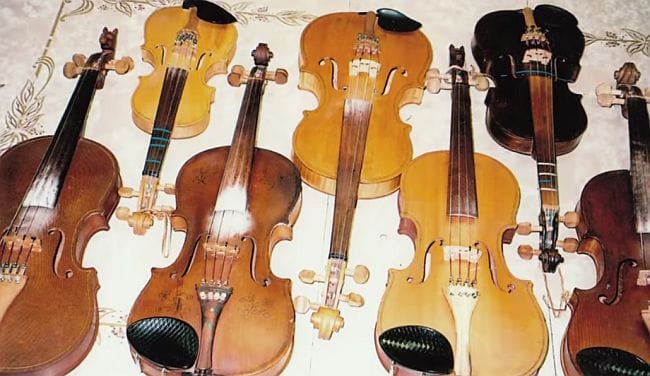 Over the decades since that first project, Hensley has built over 70 fiddles (she numbers each one), most of them in the years since she turned 44. The 27 or so year gap between fiddle number four and fiddle number five was caused by the birth of nine children. Seems raising babies and fiddle-making are hard to do at the same time. Hensley has estimated that each instrument requires approximately 260 hours, or two weeks of 8-hour days of work, stating “You make a five-gallon bucket full of shavings out of a fiddle.”
