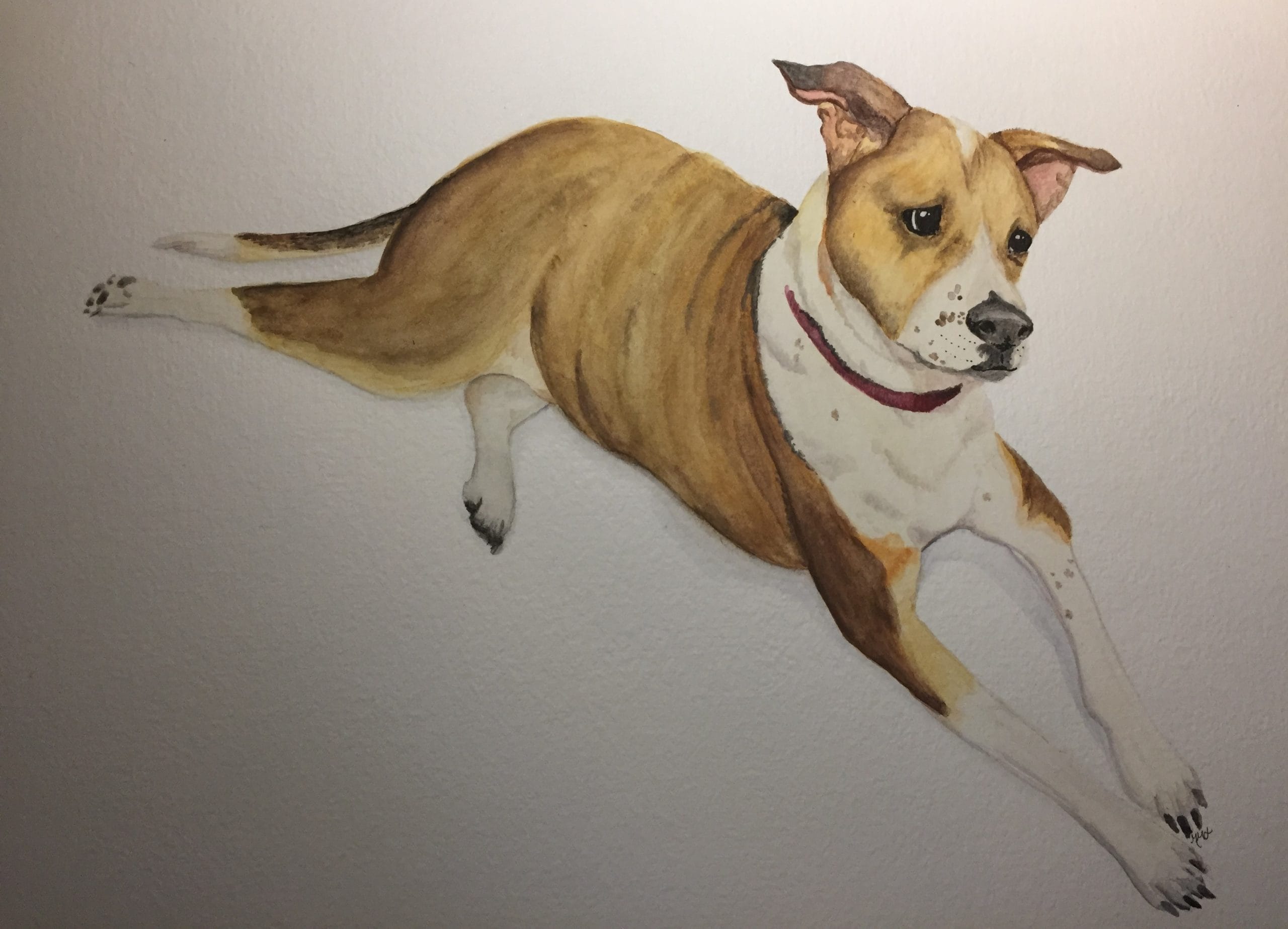 Ideally, when a painting is commissioned, she likes to receive two to four pictures so she can get a feel for the pet’s personality and identify markings that make that pet unique. She prefers a photo of the pet facing the camera, as opposed to tilted to the side. Many of her portraits are just of the face and torso, so it helps to have a clean, clear picture of the animal’s head and face so she can get the details.