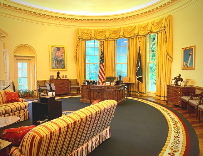 Special Features: replica Oval Office and Cabinet Room, interactive timeline, inauguration gown, Presidential china, Clinton School of Public Service