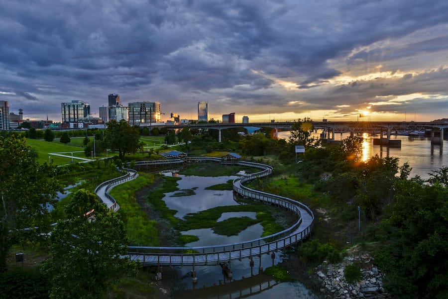 In 2011, the former Rock Island Railroad Bridge was converted into a pedestrian bridge and renamed the Clinton Presidential Park Bridge. As you cross over the Arkansas River, you can enjoy an incredible view of the Little Rock skyline.