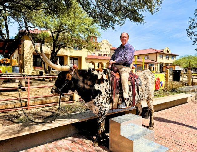 So, for our day date, I drove him down to the Stockyard area of Fort Worth to observe and look around since he usually must be the one to pay attention. He loved seeing changes in the city, riding a steer, eating some incredible barbecue, and visiting the True Grit Museum – John Wayne: An American Experience.