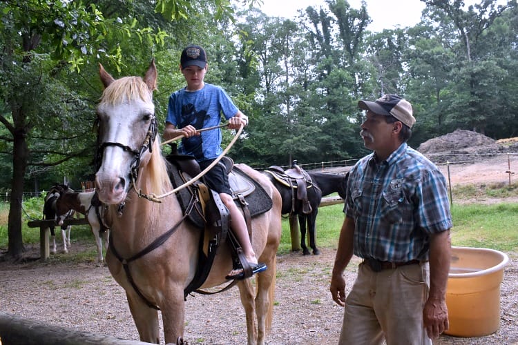 My children and I went to Mountain Harbor to experience the fun. Upon our arrival, some of the horses were already saddled and ready. My children loved seeing a horse the workers were breaking in and meeting the horses they would ride on the trail. Chief, a beautiful strawberry roan horse who is also one-quarter paint horse, is the oldest of the herd. One of the original horses at Mountain Harbor, he stands quiet and calm and allows young hands to pet him and take his reins without fuss.